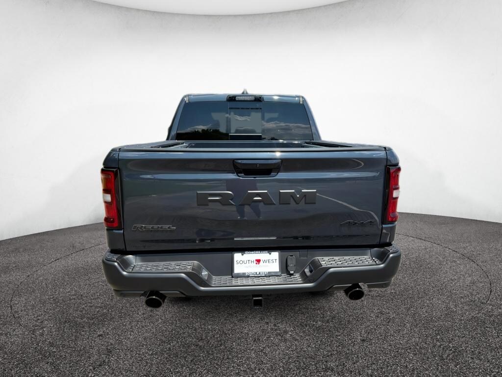 Technology Group: Head Up Display; LED CHMSL Lamp; Digital Rearview Mirror; 12-Way/1-way Trailer Connector. Quick Order Package 21W Rebel. Rebel Level 2 Equipment Group: Google Android Auto; SiriusXM Radio Service; USB Host Flip; Rear Window Defroster; Rain Sensitive Windshield Wipers; Integrated Center Stack Radio; Power Adjustable Pedals with Memory; Front Passenger Interactive Display; Integrated Voice Command with Bluetooth; Power 2-Way Passenger Lumbar Adjust; Connectivity - US/Canada; Auto Power-Folding Mirrors; GPS Navigation; 4G LTE Wi-Fi Hot Spot; 115V Auxiliary Rear Power Outlet; GPS Antenna Input; Media Hub with 2 Charge Only USBs; Exterior Mirrors with Heating Element; Proximity Approach/departure Lamps; Auto Dim Exterior Driver Mirror; SiriusXM with 360L; Accent Color Door Handles; Global Telematics Box Module; Connected Travel and Traffic Services; Heated Second Row Seats; Power Adjust 8-Way Front Passenger Seat; Security Alarm; Apple CarPlay; Black Painted Exterior Mirrors Caps; Off-Road Information Pages; Exterior Mirrors Approach Lamps; Disassociated Touchscreen Display; HD Radio; Smartphone as a Key Capable; 14.4 Touchscreen Display; Accent Color Premium Power Mirrors; Dual Wireless Charging Pad; Exterior Mirrors with Supplemental Signals; Exterior Mirrors Courtesy Lamps; Uconnect 5 Nav with 14.4 Display; Harman/kardon 19 Speaker Premium Sound; 2-Door Passive Entry. Front Door Locks; Accent Color Tailgate Handle; Exterior Mirrors with Memory; Driver Seat Memory; Power Tailgate; Convex Wide-Angle Exterior Mirror Insert; Radio/driver Seat/mirrors/pedals Memory. Lux Leather Trimmed Bucket Seats. RamBox Cargo Management System. 33 Gallon Fuel Tank. Forged Blue Metallic. Forged Blue Metallic. **Equipment listed is based on original vehicle build and subject to change. Please confirm the accuracy of the included equipment by calling the dealer prior to purchase.**